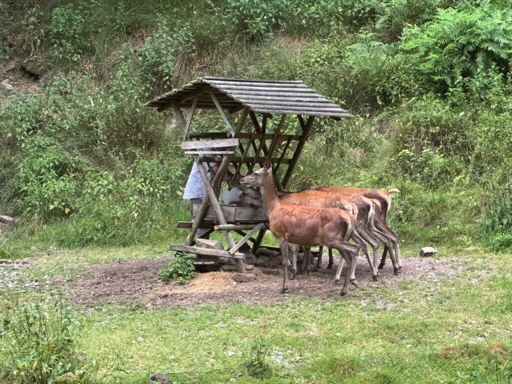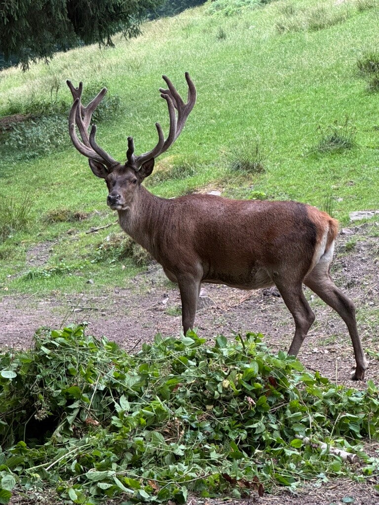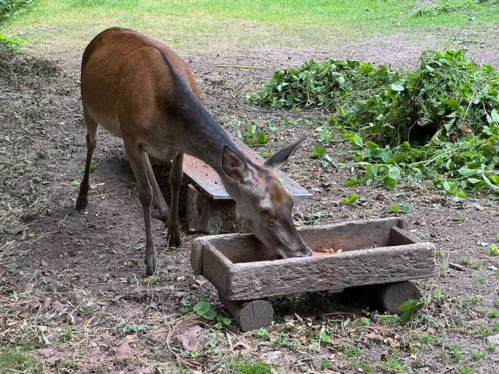 Das Rotwild ist zwar sehr anpassungsfähig, aber von Natur aus kein reiner Waldbewohner. Da die Trockenperioden der letzten Jahre nur wenig Graswuchs im Gelände zuließen, hat Zoister die Brombeerhecken am Waldrand abgemäht und die Dornenbüsche ins Gehege geworfen. „Das ist das beste Futter weit und breit und ein echtes Zuckerbrot für die Tiere“, sagt der Wildhüter, der im gleichen Atemzug darauf verweist, dass Spaziergängern die Wildtierfütterung generell untersagt ist. „Die Tiere sind keine reinen Grasfresser. Gras enthält zu wenig Nährstoffe und liefert kaum Energie – gerade die wird aber für die Geweihbildung benötigt“, erklärt Zoister. Daher sind Knospen, Blätter, Rinden und Zweige ein begehrtes Extra. Vier Muttertiere und vier Kälber zählt die Herde derzeit, und gerade für die Aufzucht der Jungtiere ist eine nahrhafte Kost entscheidend.